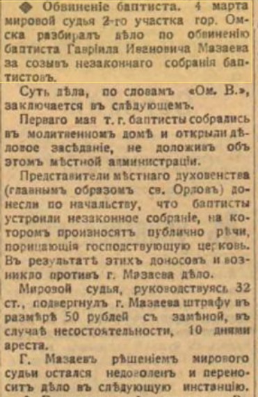 Выйдя на воздух, мы застали многих, очевидно, православных, один из которых промолвил: «что если бы наши священники говорили такие же проповеди: здесь не было бы и одной трети!... В другой толпе слышится:» это что еще, скоро приедет брат его, Дей Иванович (Мазаев), вот кого послушать-то: соловей, да и только!.. Но Дея Мазаева не дождались, а вместо него в Омск приехал молодой человек баптист Савельев, окончивший классическую гимназию (известный штундо-баптистский миссионер-оратор. окончивший Гамбургскую баптистско-миссионерскую, примеч. автора).